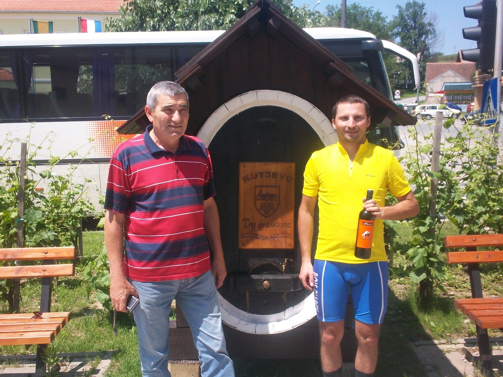 Aici iar am parte de un moment de procopseala intalnind patronul unei crame care ma invita la o terasa, ma serveste cu niste beri, imi face cadou o sticla de vin si-mi da si niste merinde de drum.